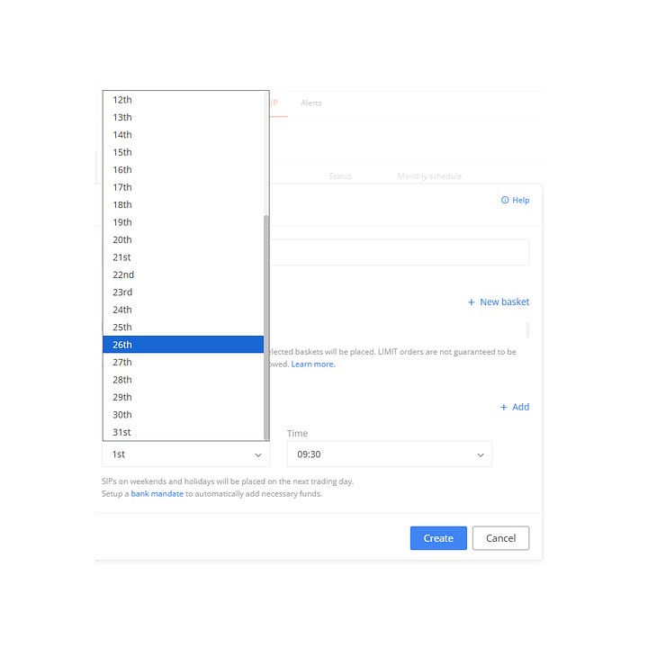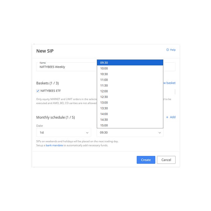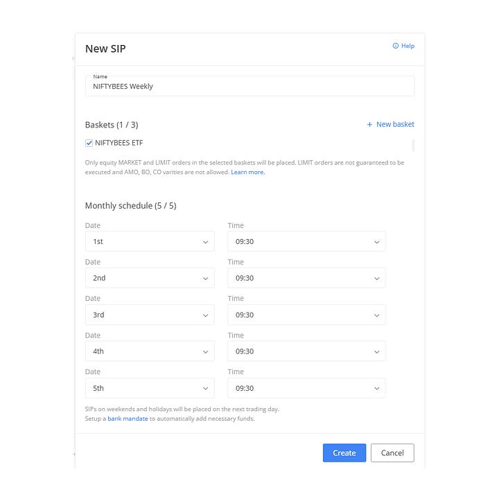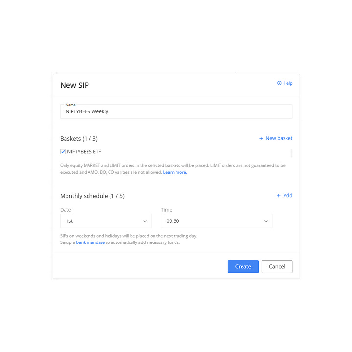 Zerodha’s SIP system inside Kite for stocks and ETFs forces you into a date-based, monthly-only structure.