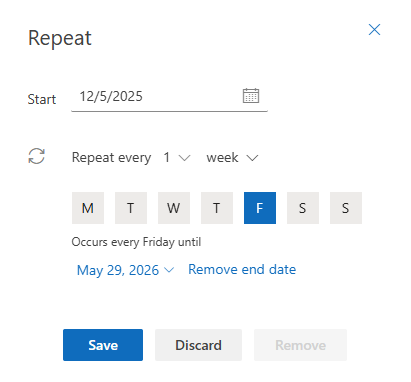 “Occurs every Tuesday and Friday at 09:30 until May 2026.