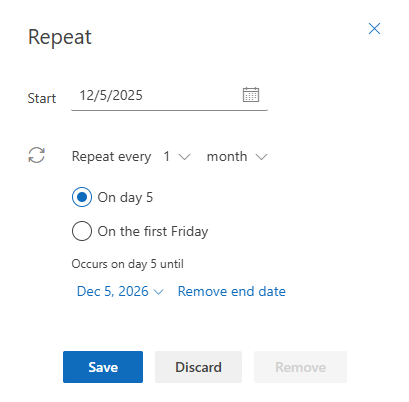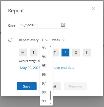 Look at how recurrence works in Outlook — arguably the best designed recurrence engine ever created.
